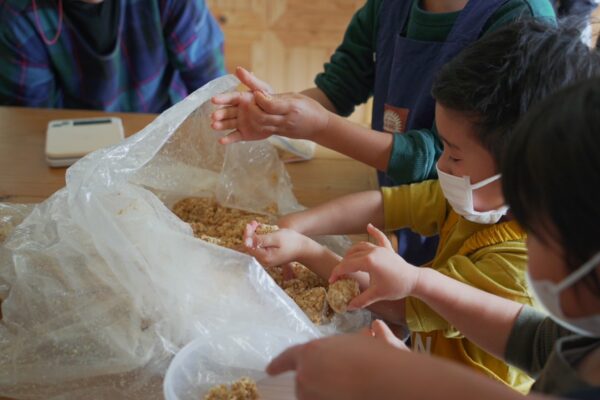 子どもたちの小さな手で大豆を潰したり、麹と塩を混ぜたり…